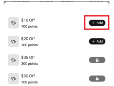 3. Select the reward by clicking the “+Add” icon. You can select as many rewards, up to the amount of points available.